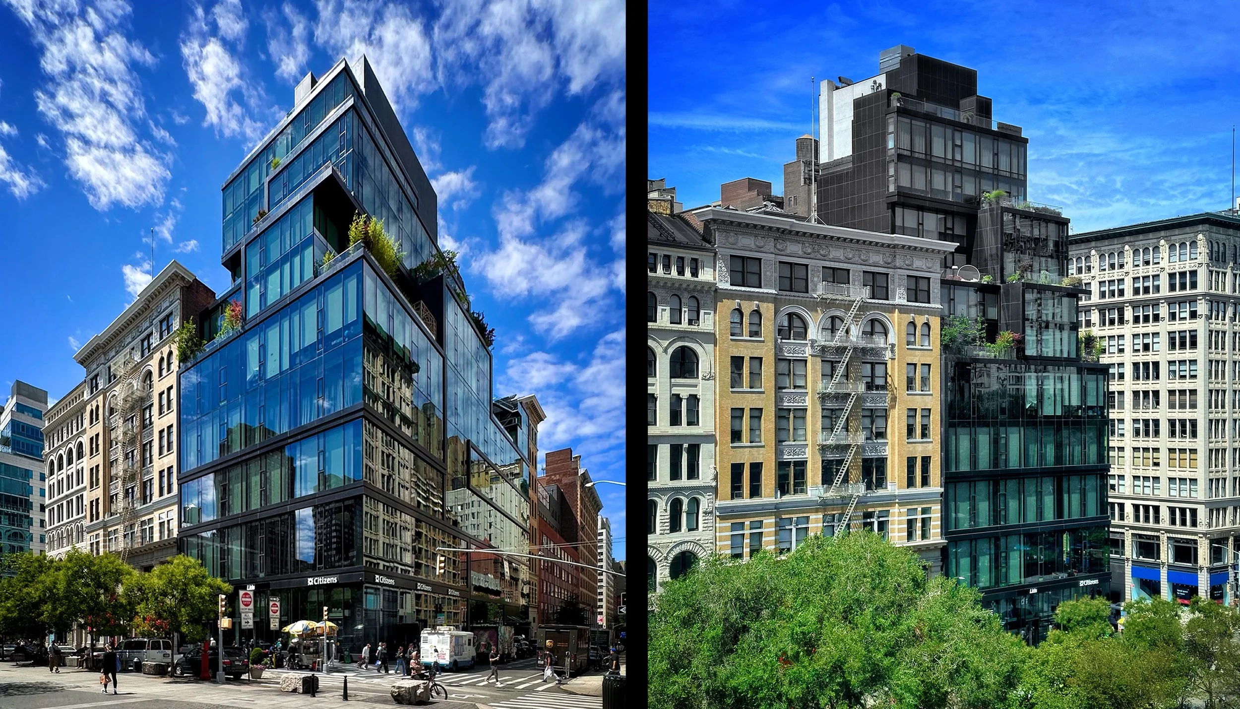 Mercer Greene is a boutique condominium that bridges SoHo’s historic cast-iron fabric with bold contemporary design. Spanning the block between Greene and Mercer Streets, its pressed enameled steel façades reinterpret 19th-century industrial character through a 21st-century lens. Behind its discreet entry, the building offers loft-style residences with soaring ceilings and a modern factory aesthetic, complemented by a newly renovated lobby, storage, bike room, and 24-hour doorman service. Set in the heart of SoHo, Mercer Greene embodies the neighborhood’s fusion of heritage, culture, and modern luxury.
